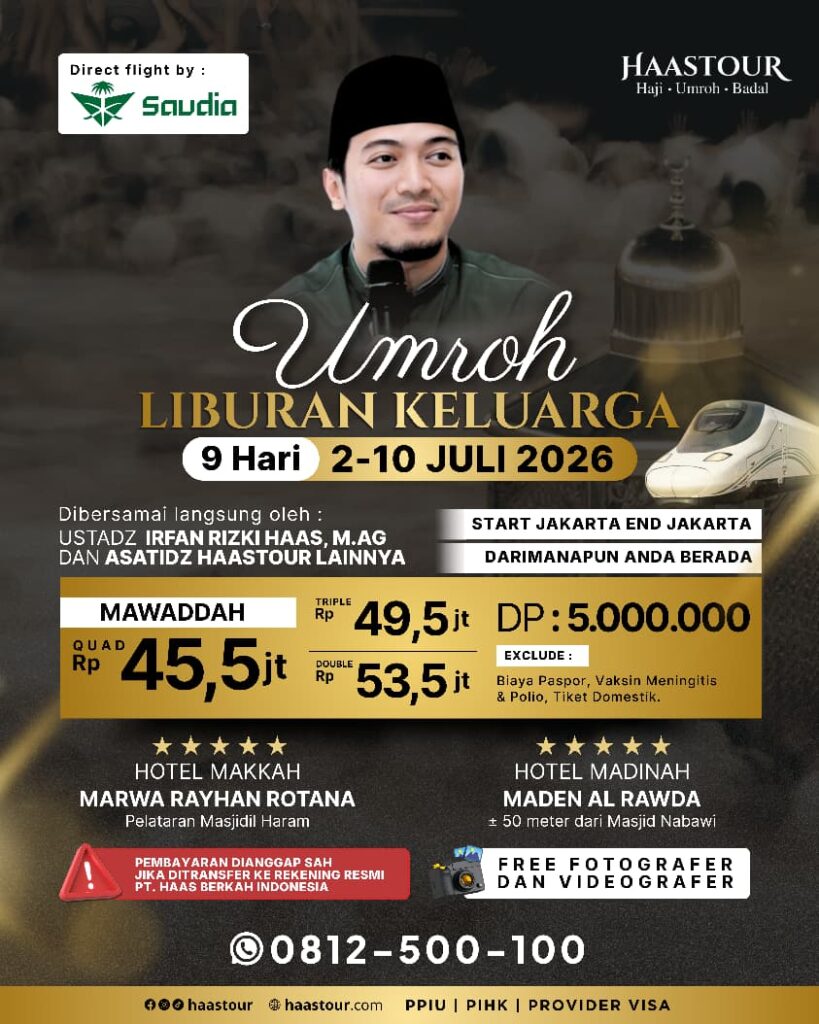 Umroh Liburan Keluarga – Paket Mawaddah Berangkat Juli Bersama Ustadz Irfan Rizki Haas, M.Ag